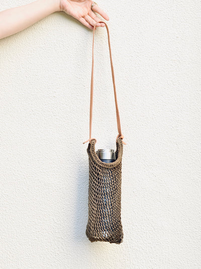 ネットバッグの片側の輪にストラップを通し、もう片側の輪に固結びをして固定する仕様なので、結ぶ位置で自由に長さの調整が可能です。