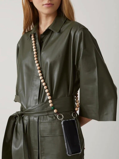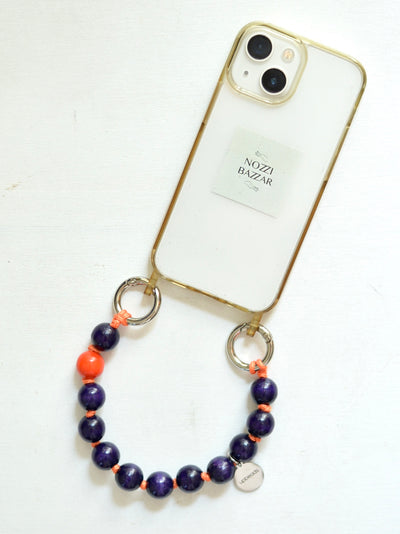 スポーティーな印象になりがちなスマホストラップですが程よい大きさのウッドビーズで身体に食い込みにくく、ネックレスのようにアクセントになるデザイン。