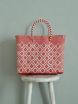 ペットボトルや海洋ごみをリサイクルしてプラスチックテープに加工し、木型にあわせて編んで手作業で編んで作るメキシコのメルカドバッグ 。