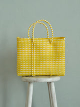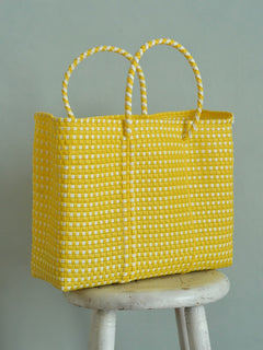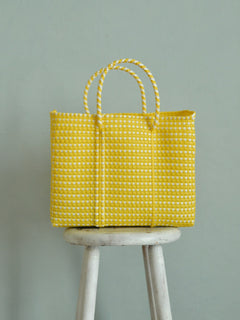 ペットボトルや海洋ごみをリサイクルしてプラスチックテープに加工し、木型にあわせて編んで手作業で編んで作るメキシコのメルカドバッグ 。