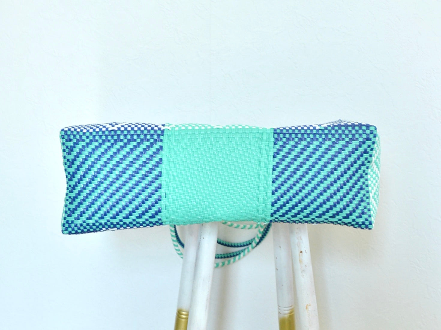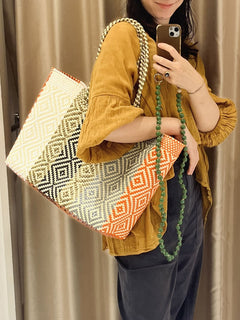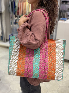 ペットボトルや海洋ごみをリサイクルしてプラスチックテープに加工し、木型にあわせて編んで手作業で編んで作るメキシコのメルカドバッグ。