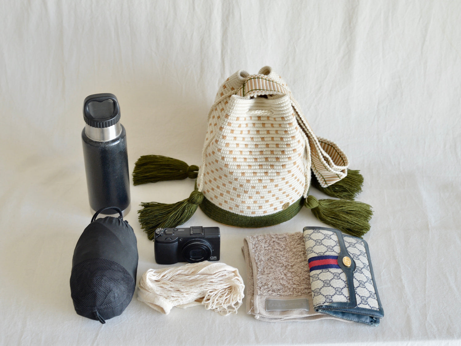용량은 800ml의 마이 병, 긴 지갑, 스마트 폰, 컴팩트 카메라, 수건, 에코 백, 포켓터블 레인 코트 등 필요한 것이 듬뿍 들어가는 크기입니다.