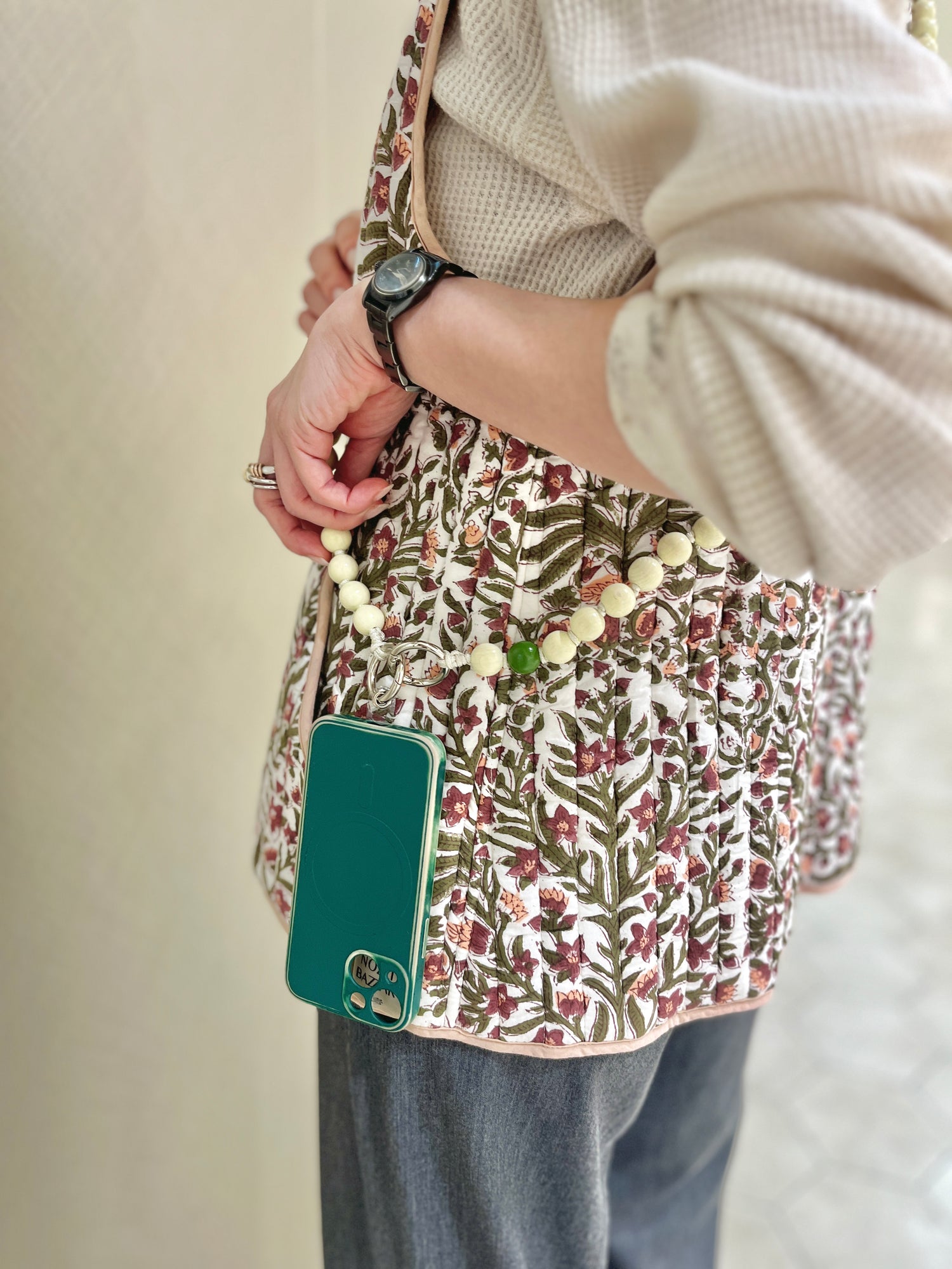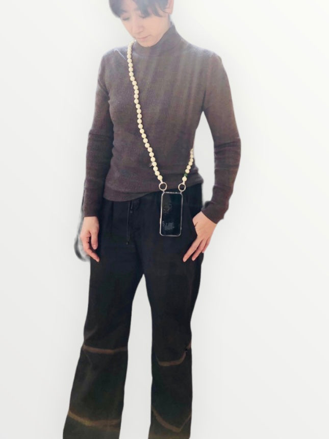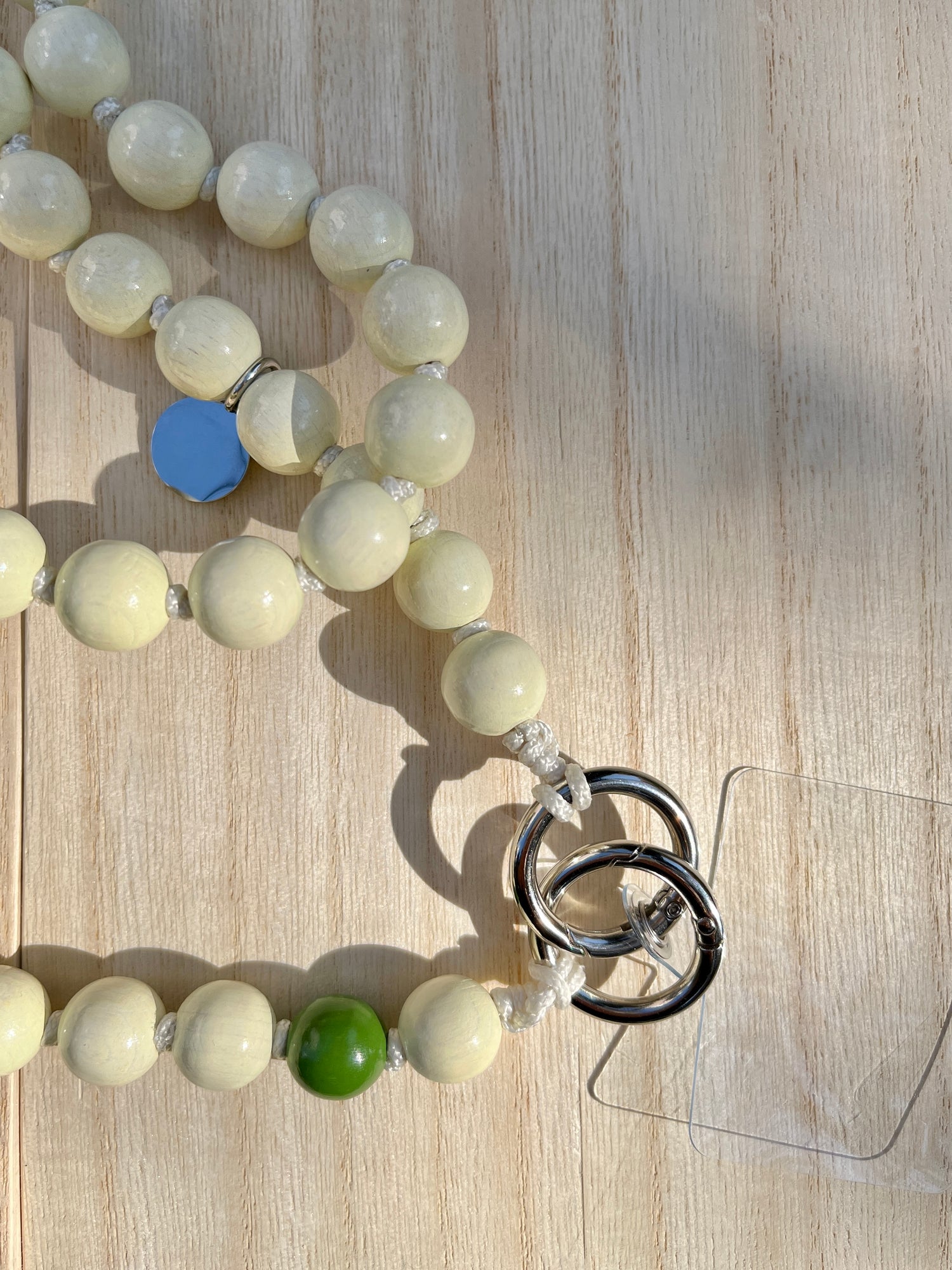スポーティーな印象になりがちなスマホストラップですが程よい大きさのウッドビーズで身体に食い込みにくく、ネックレスのようにアクセントになるデザイン。