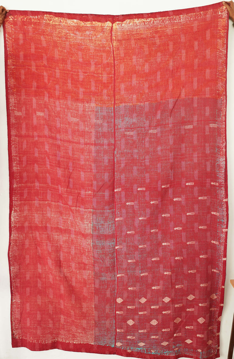 町から遠く離れた国境近くの村の人々が日常生活で使うために製作し、補強や継ぎ接ぎをして何十年も大事に使われてきた布。結婚の際には嫁入り道具の一つにするほど、暮らしに欠かせない布です。