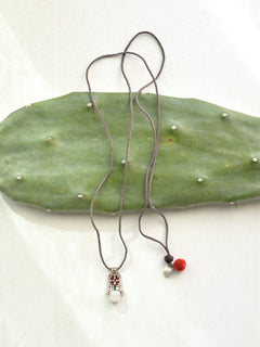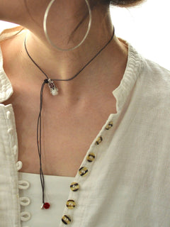 ソフトな手触りのヤギ革のアジャスターでお好きな長さに調節ができます。チョーカーや、ネックレスとして、また手首にぐるぐると巻いてエンドのポンポンとヤギ革をコードに引っ掛ければブレスレットに。3wayで楽しめます。
