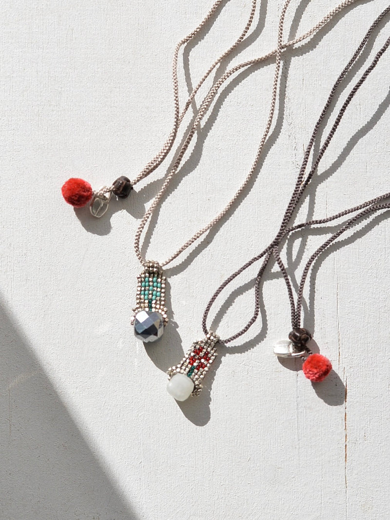 【素材】ビーズトップ、シルクコード、ヤギ革アジャスター、シルバーチャーム、ポンポンシルク
