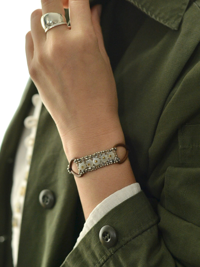 光に反射してきらっと光るビーズとクールなレザーの絶妙なバランス。(↑動画もご覧ください。)ひとつでも存在感のあるブレスレットですが、シルバーやほかのブレスレットと重ね付けしても馴染むので、アレンジも楽しいです。