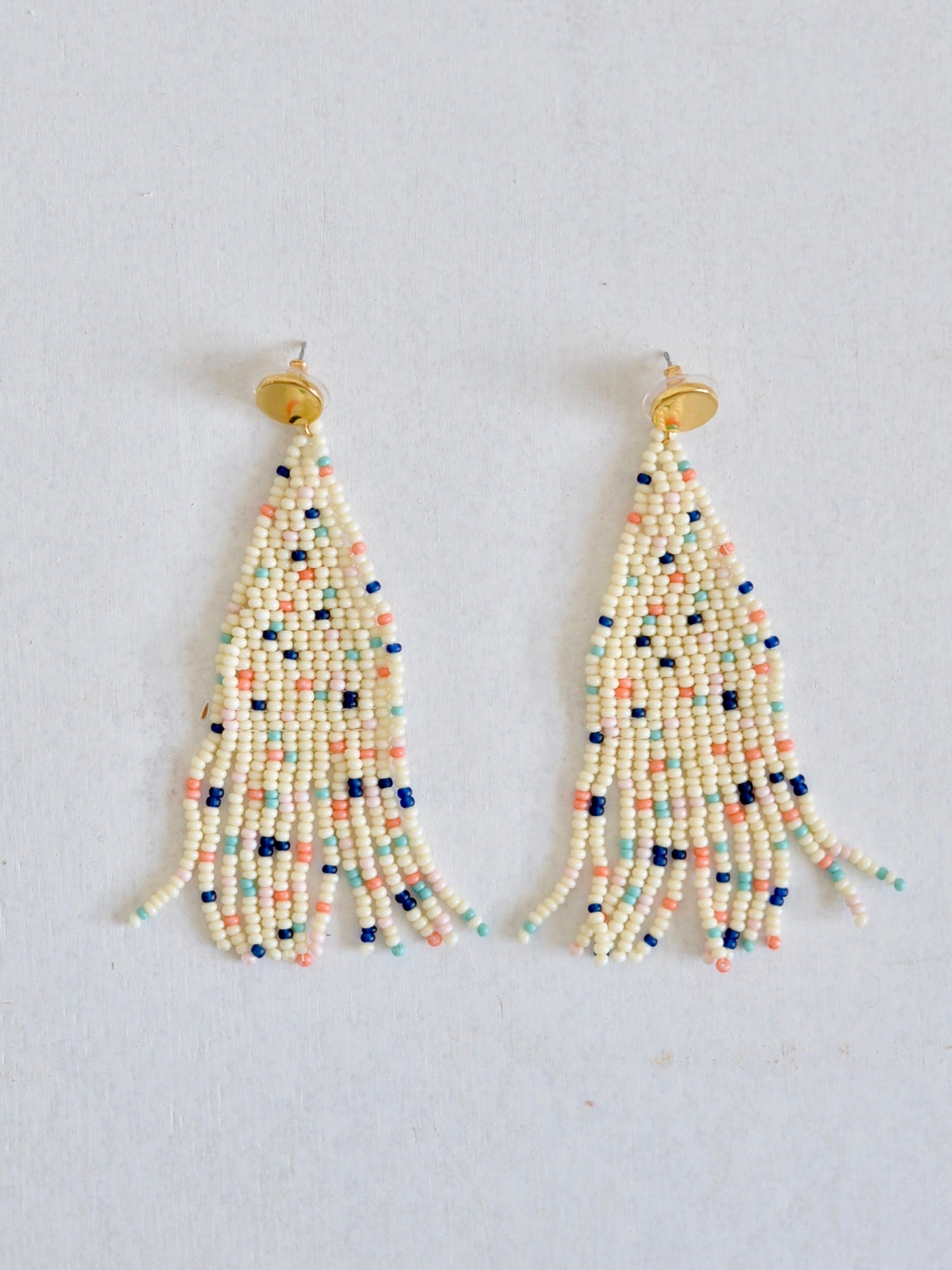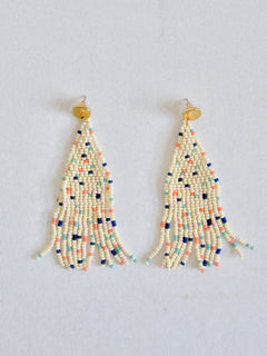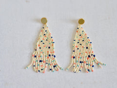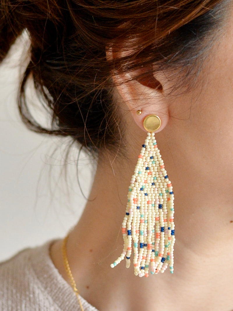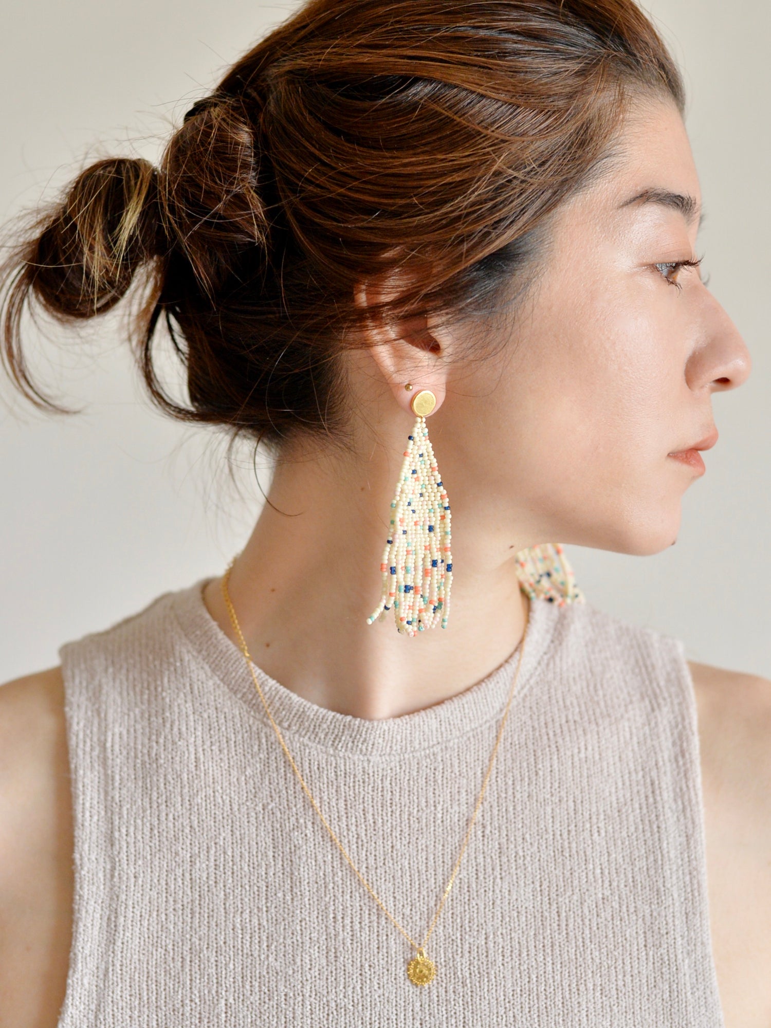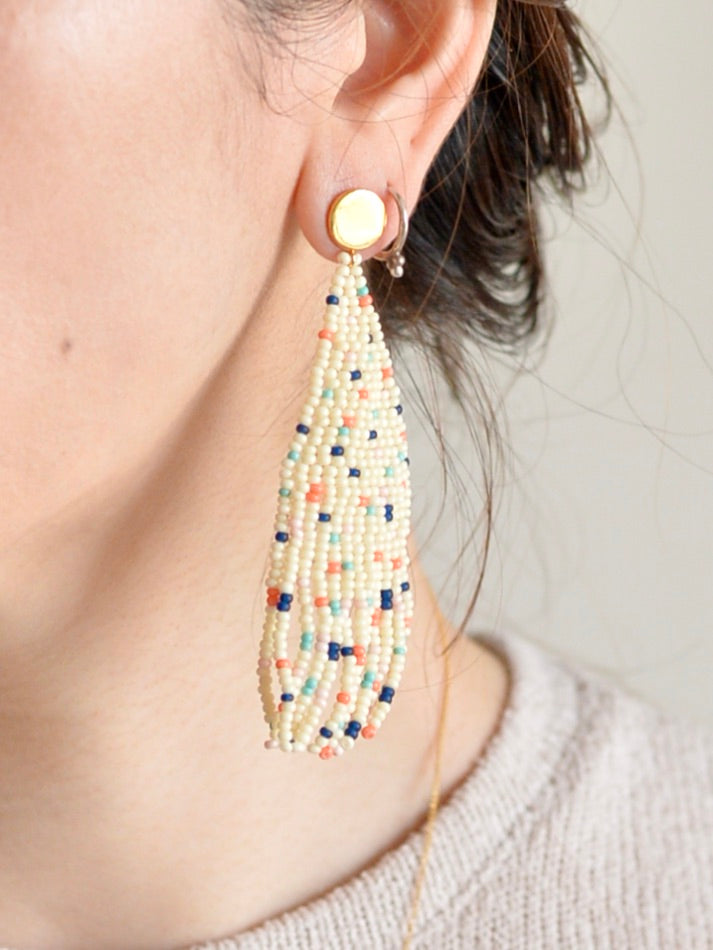 ちらばったマルチカラーがかわいい手編みのビーズピアス。