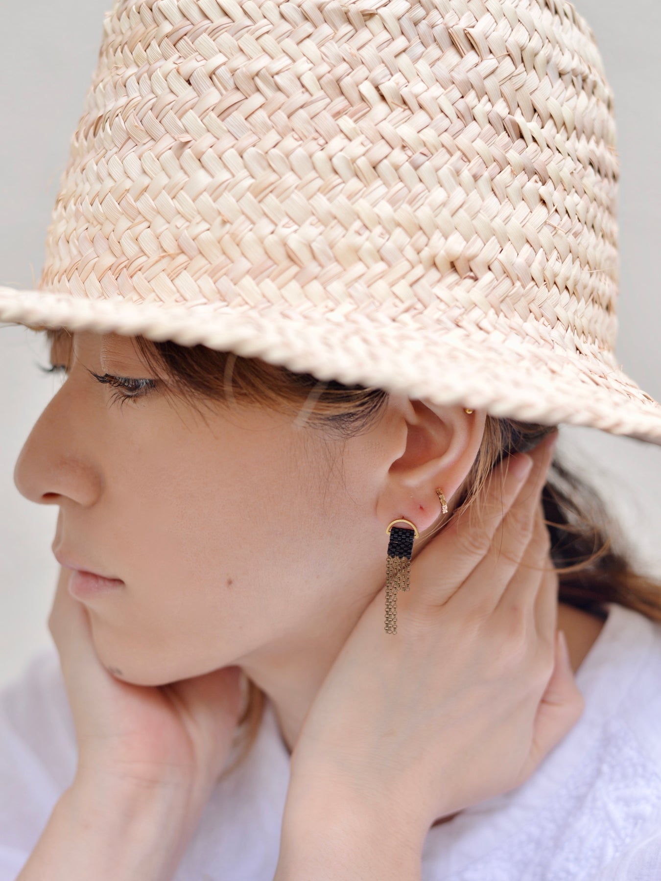 彼女のつくるエレガントでモダンなジュエリーの中から、 アシンメトリーの真鍮チェーンが印象的なピアスセレクトしました。