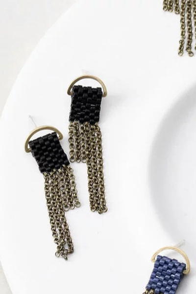 彼女のつくるエレガントでモダンなジュエリーの中から、 アシンメトリーの真鍮チェーンが印象的なピアスをセレクトしました。