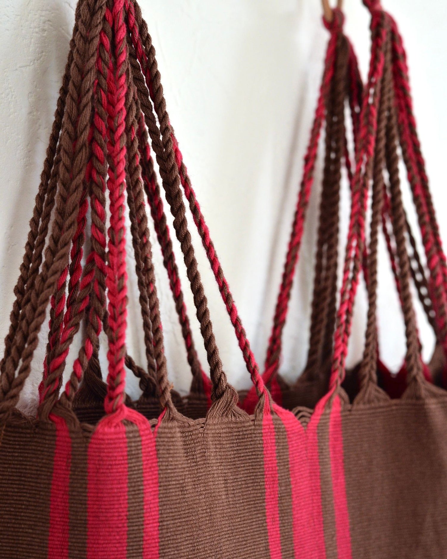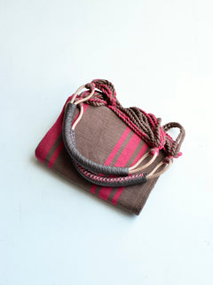 最近はアジア産の模倣品がありますが、メキシコの織物を家業とする織り手が時間をかけて織り上げた当店のハンモックバッグは、素朴さの中に端正さがあります。