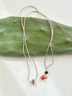 ソフトな手触りのヤギ革のアジャスターでお好きな長さに調節ができます。チョーカーや、ネックレスとして、また手首にぐるぐると巻いてエンドのポンポンとヤギ革をコードに引っ掛ければブレスレットに。3wayで楽しめます。