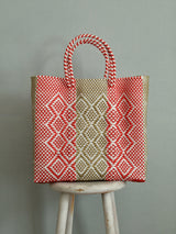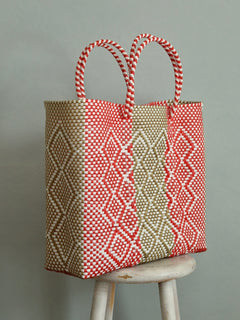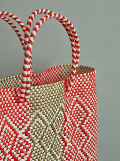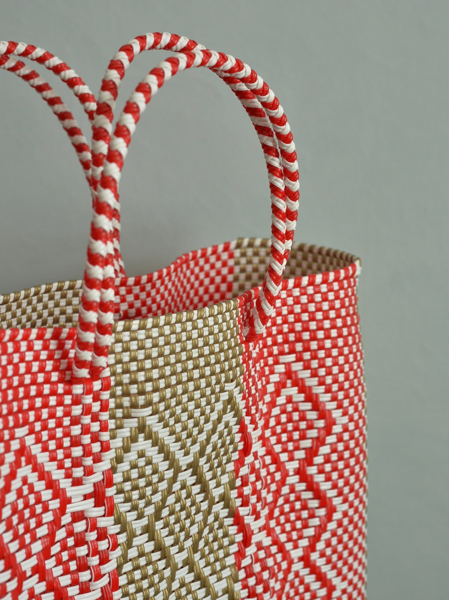 ペットボトルや海洋ごみをリサイクルしてプラスチックテープに加工し、木型にあわせて編んで手作業で編んで作るメキシコのメルカドバッグ 。