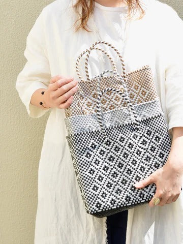ペットボトルや海洋ごみをリサイクルしてプラスチックテープに加工し、木型にあわせて編んで手作業で編んで作るメキシコのメルカドバッグ 。