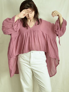 胸下とスリーブの途中から入ったギャザーがフェミニンな雰囲気です。