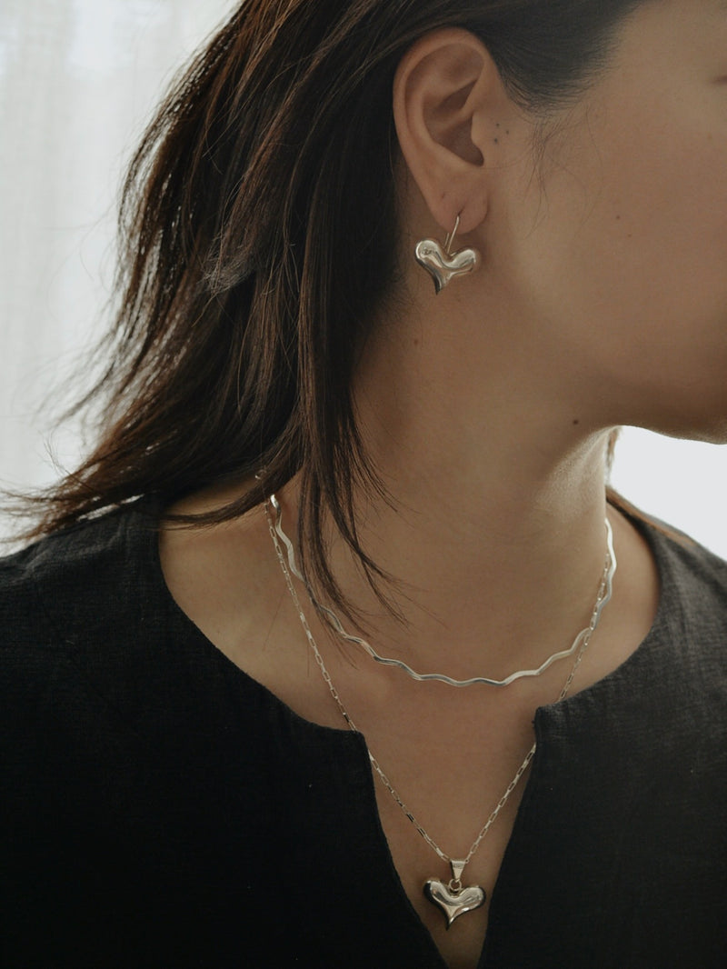 存在感のある大きめのハートとシルバーのシャープな輝きがコーディネートのスパイスに。