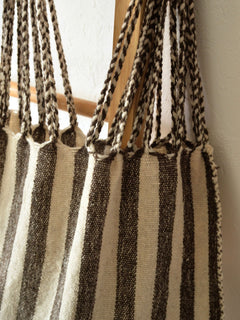 最近はアジア産の模倣品がありますが、メキシコの織物を家業とする織り手が時間をかけて織り上げた当店のハンモックバッグは、素朴さの中に端正さがあります。