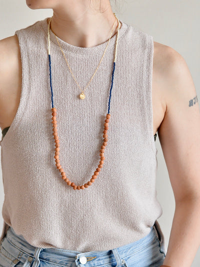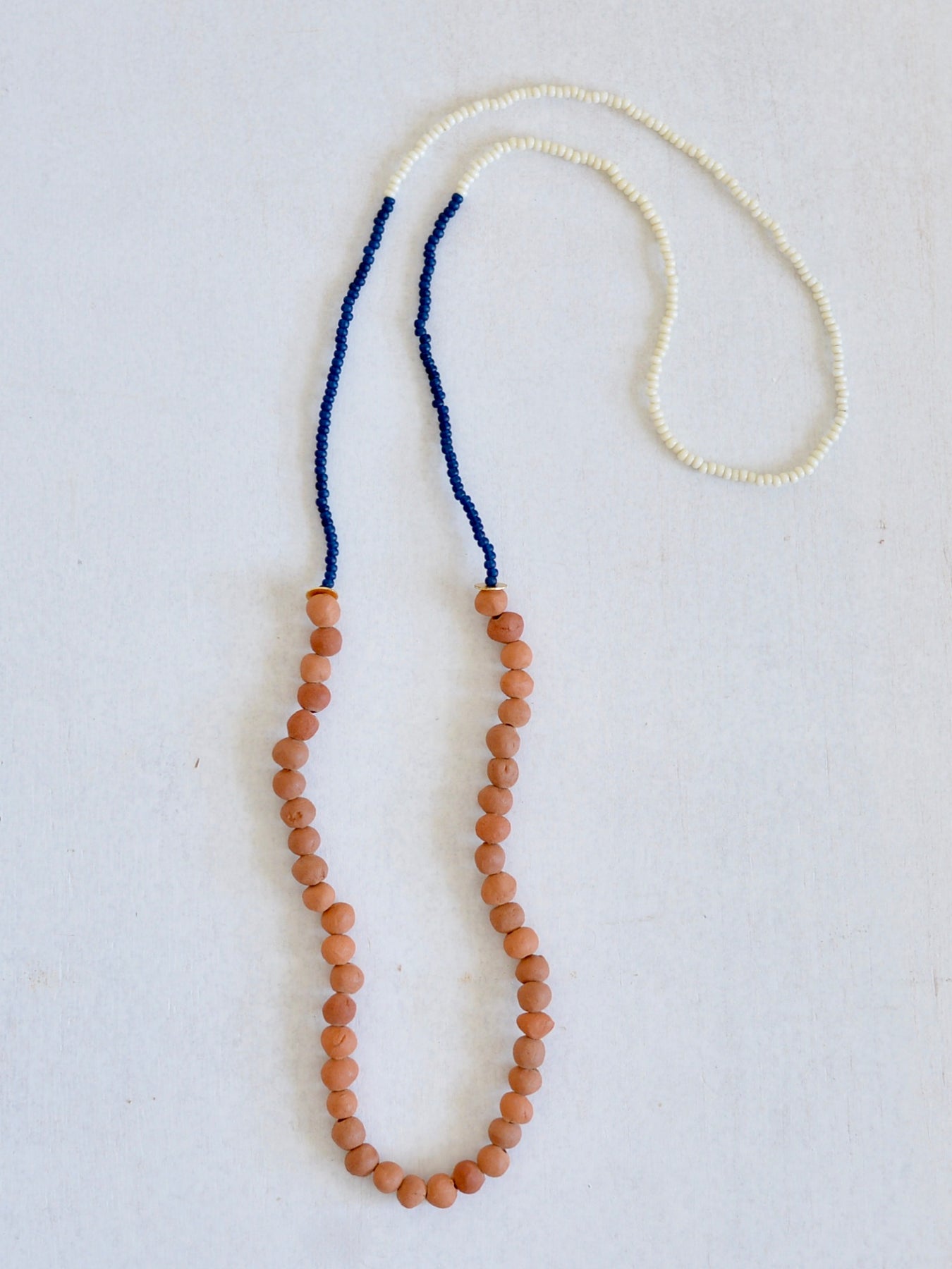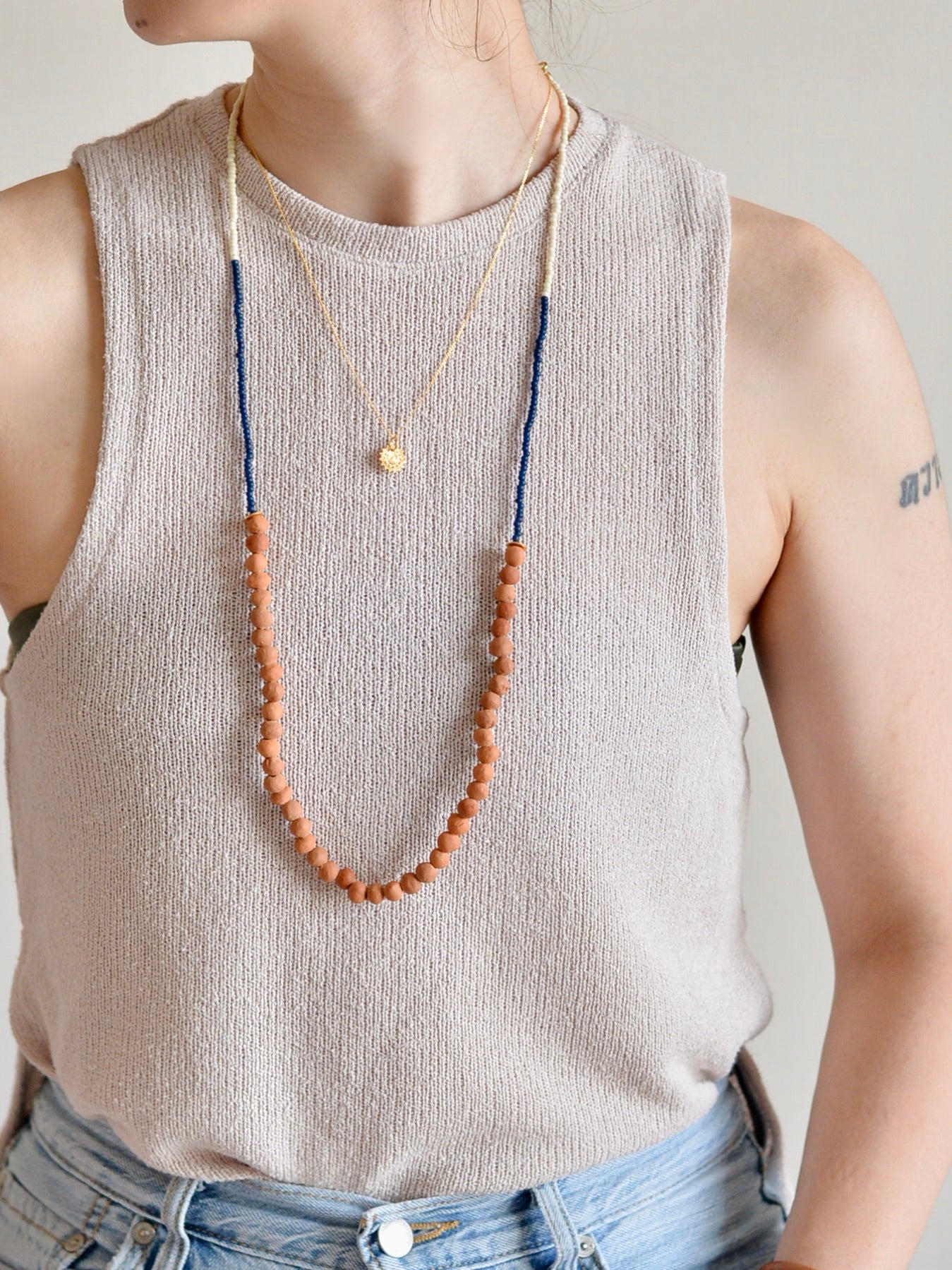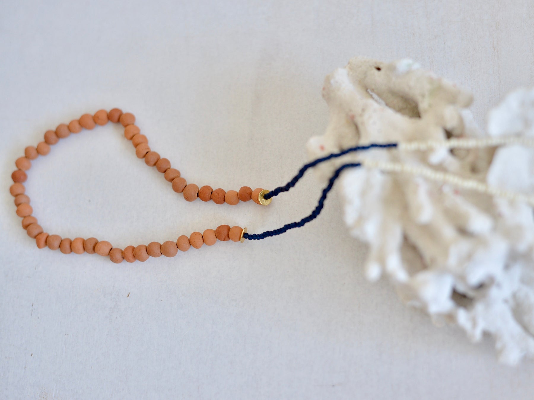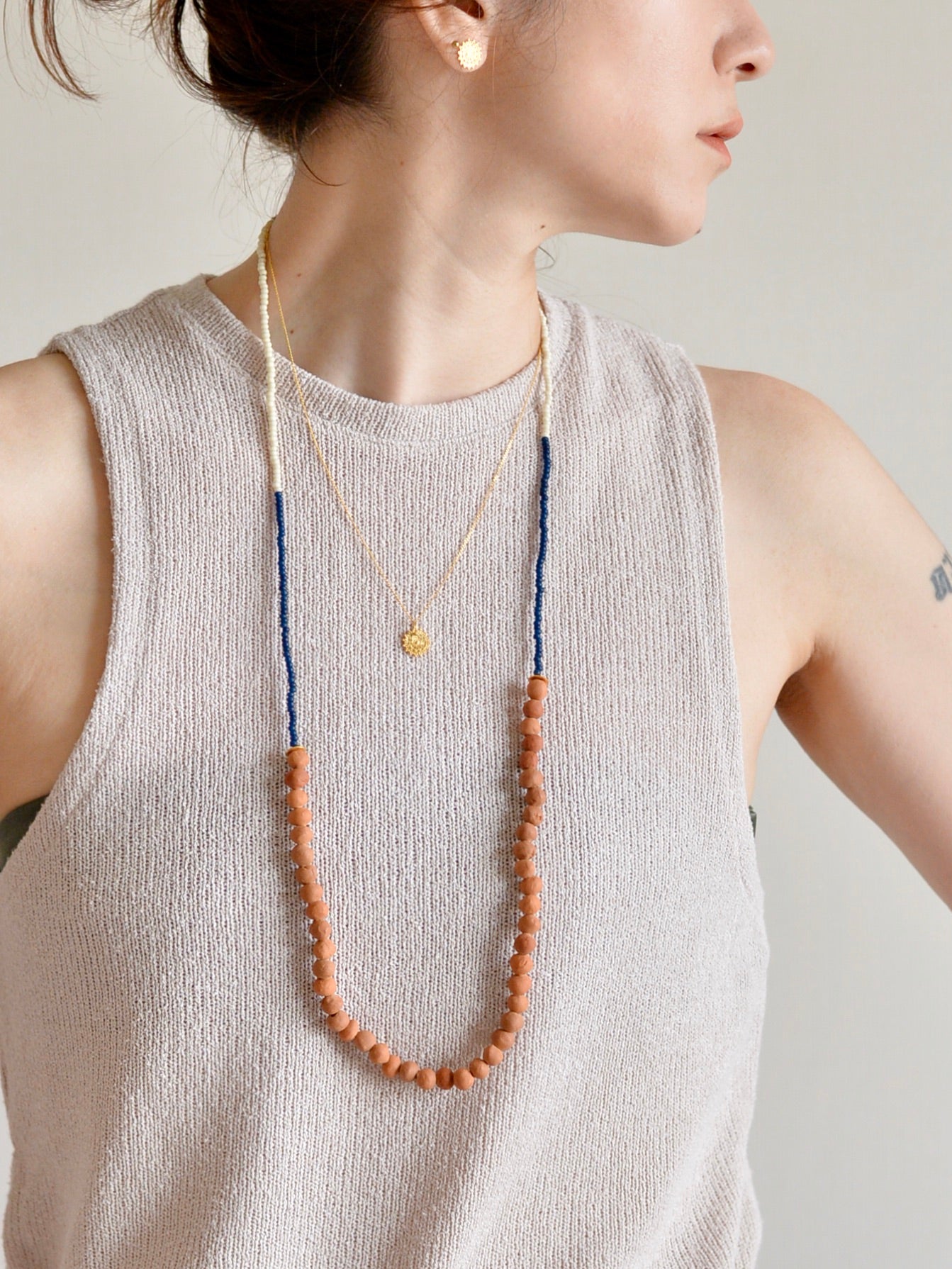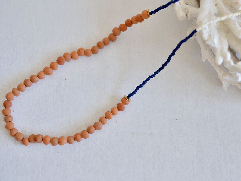 1つ1つ手作業で成形したテラコッタのビーズとガラスビーズを組み合わせたネックレス 。