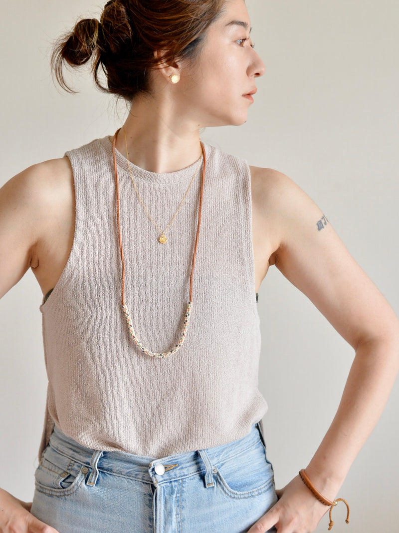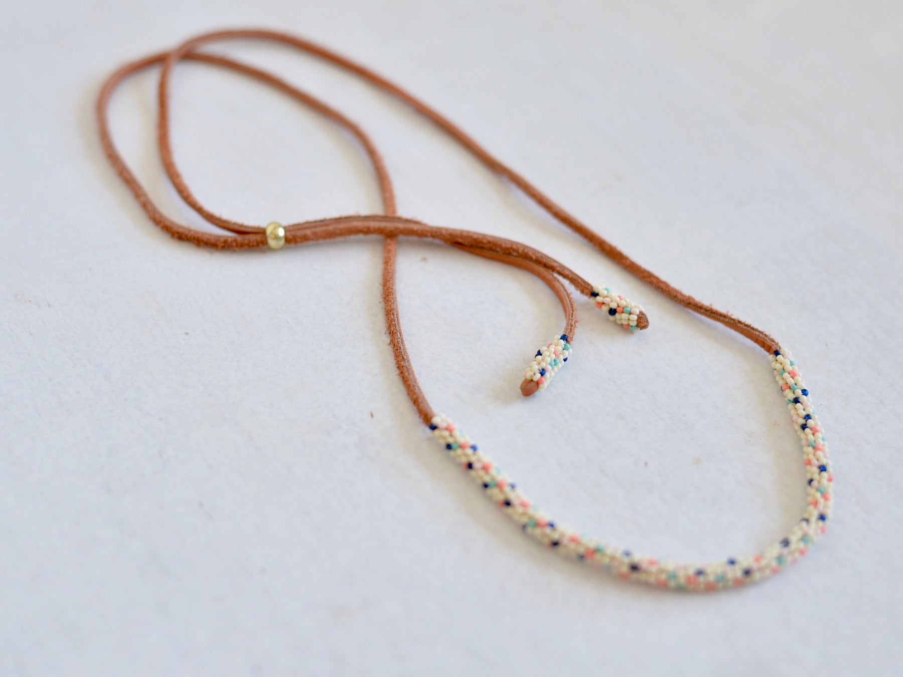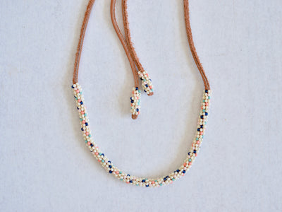 ちらばったマルチカラーがかわいい手編みのビーズネックレス 。
