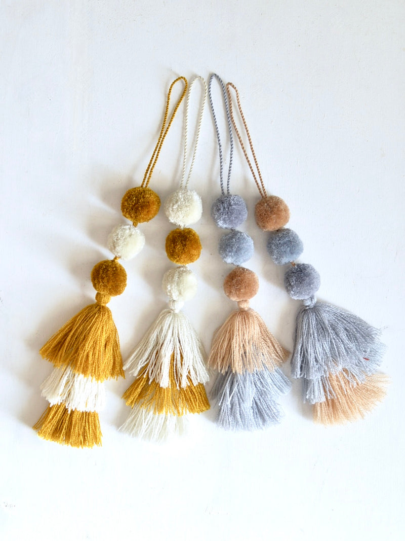 【サイズ】全長 約27cm ポンポンからタッセルまで 約18cm ハンドメイドのため個体差があります。表記サイズは目安であり、1~2cmほど前後する場合があることを予めご了承ください。