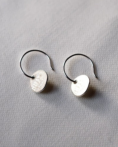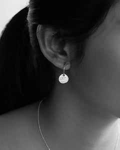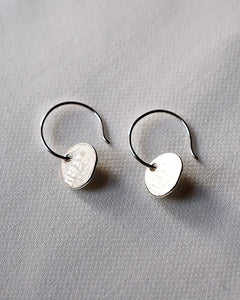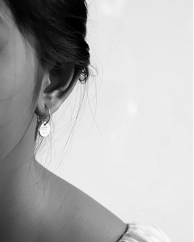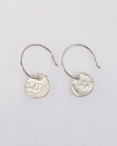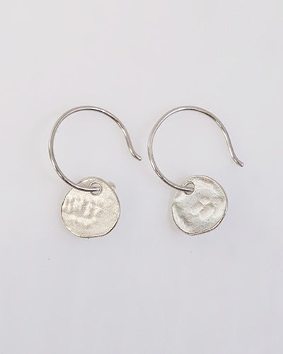 小さなオープンフープにシルバーコインをフリーハンドであしらったデザインのピアス。