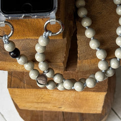 スポーティーな印象になりがちなスマホストラップですが程よい大きさのウッドビーズで身体に食い込みにくく、ネックレスのようにアクセントになるデザイン。