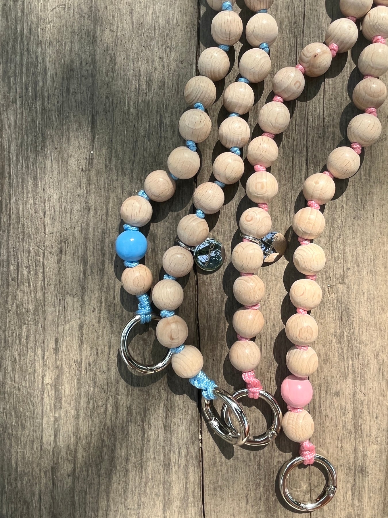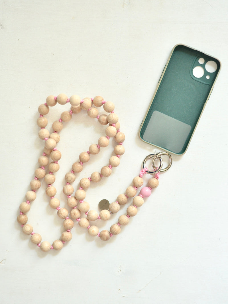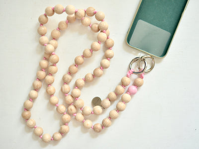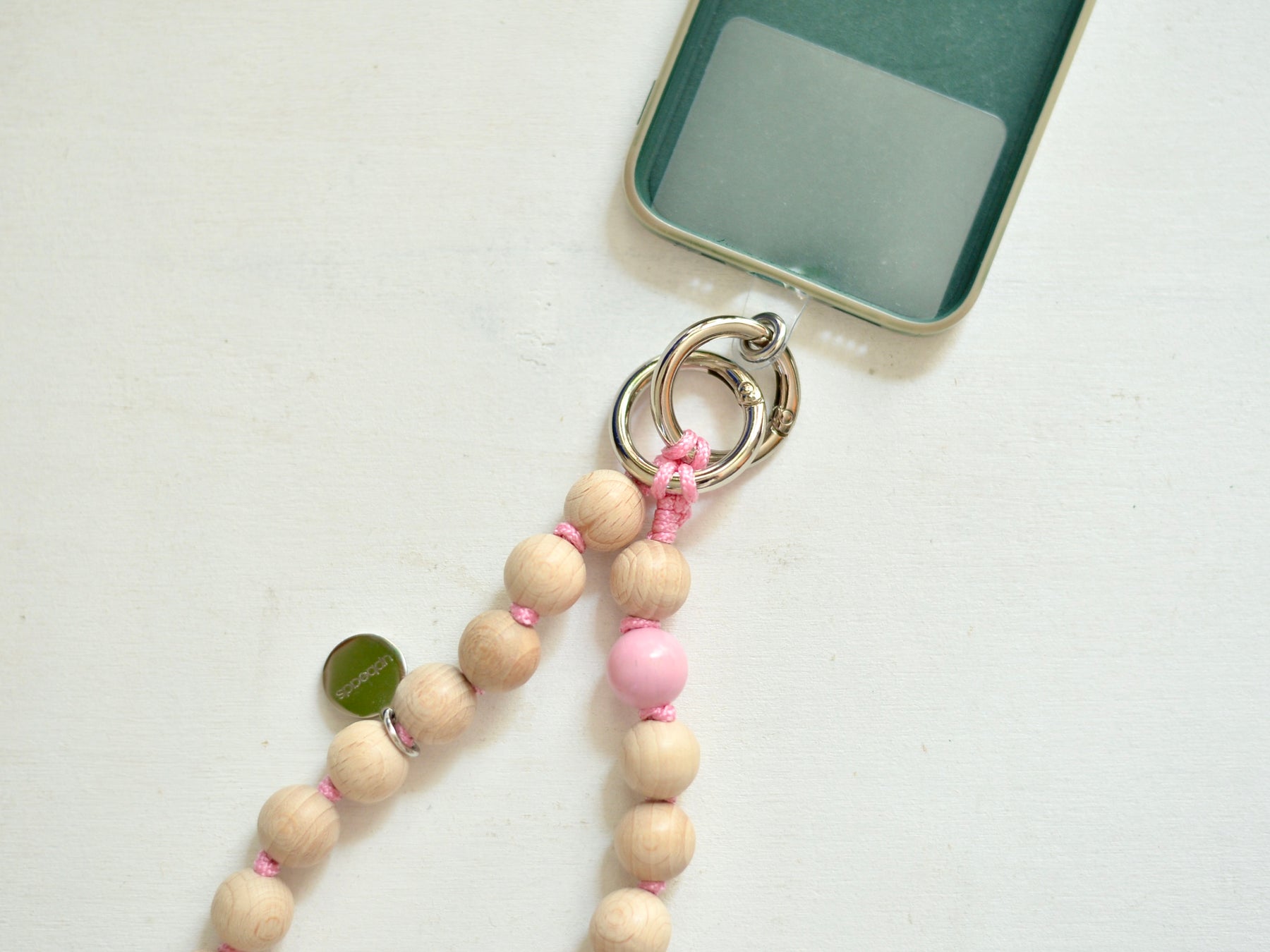 スポーティーな印象になりがちなスマホストラップですが程よい大きさのウッドビーズで身体に食い込みにくく、ネックレスのようにアクセントになるデザイン。