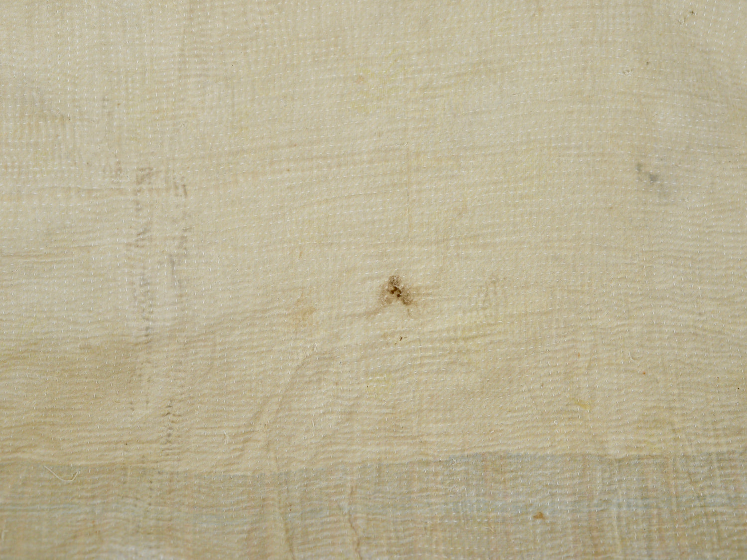 こちらはクリームイエローの布ところどころに染みがあります。小さな破れ、色あせも見られます。