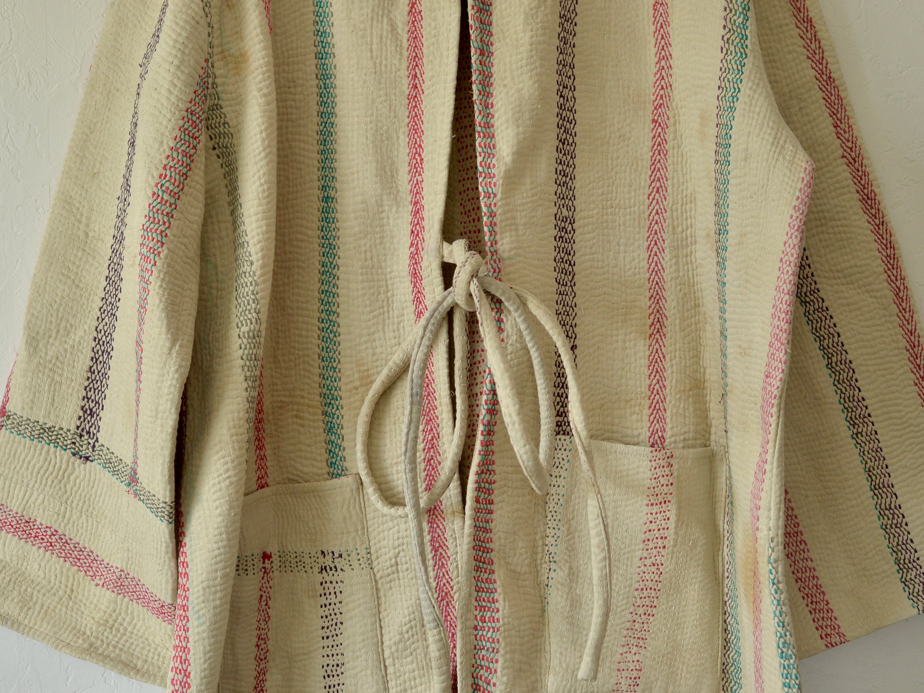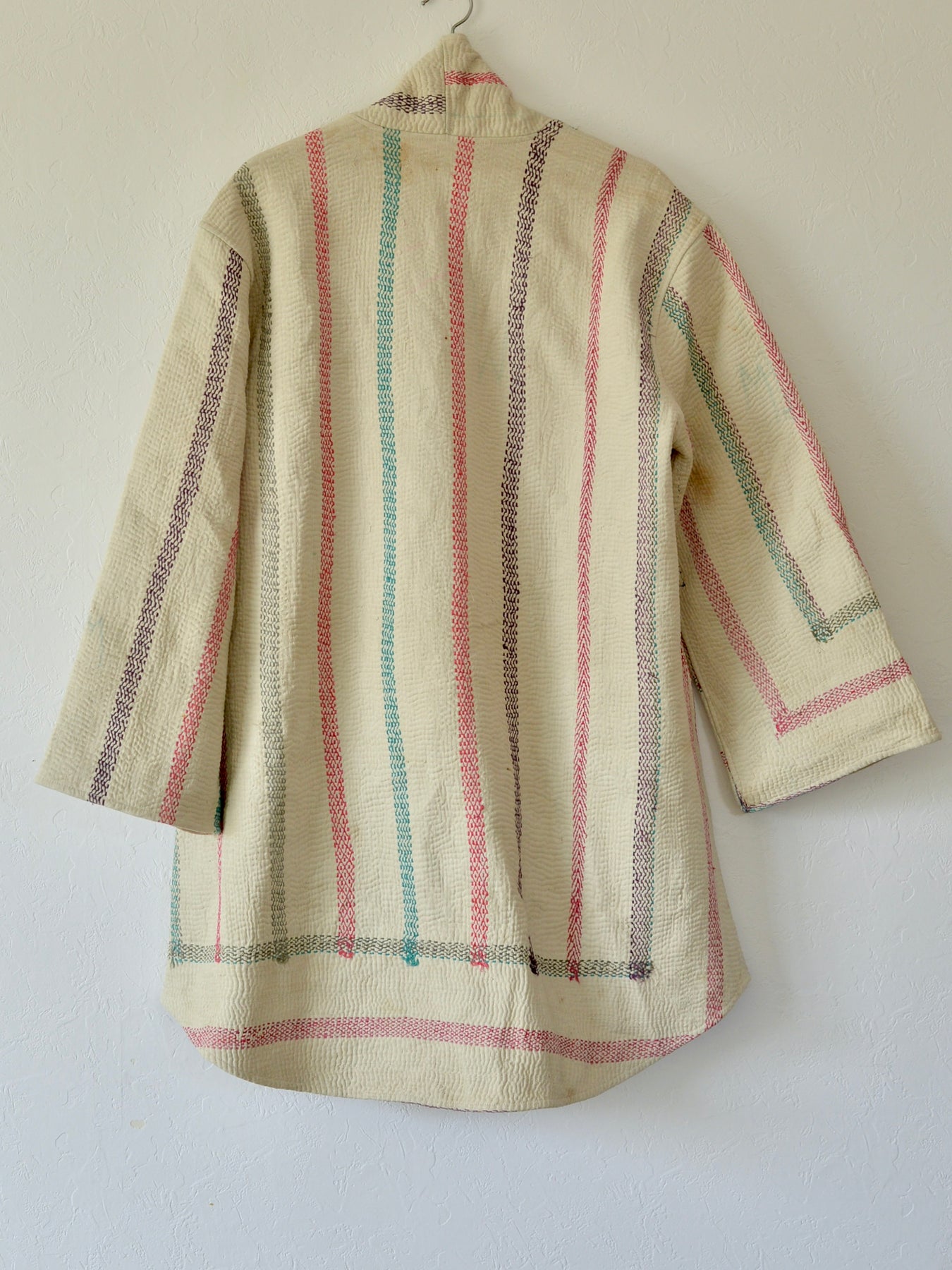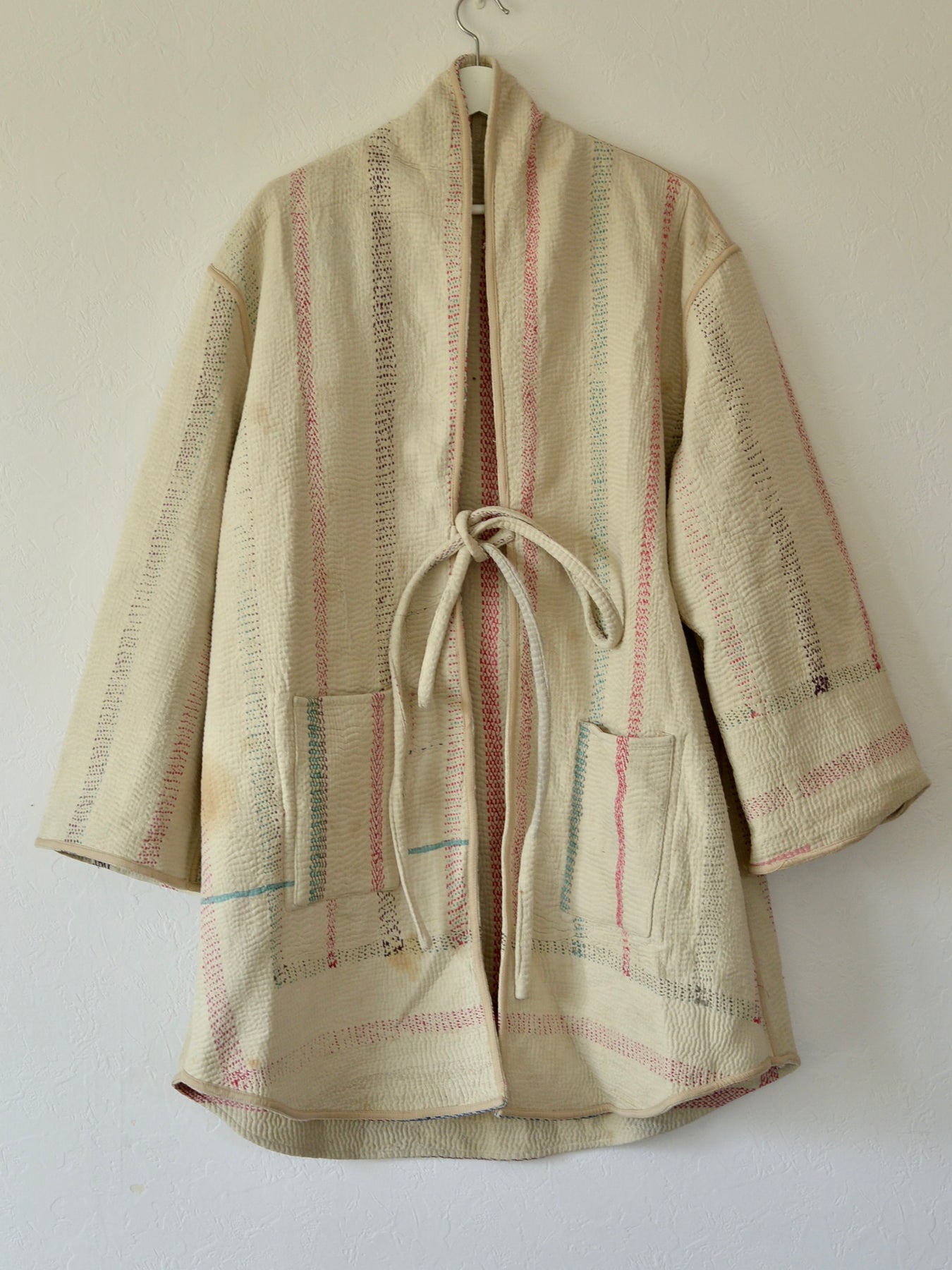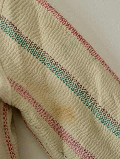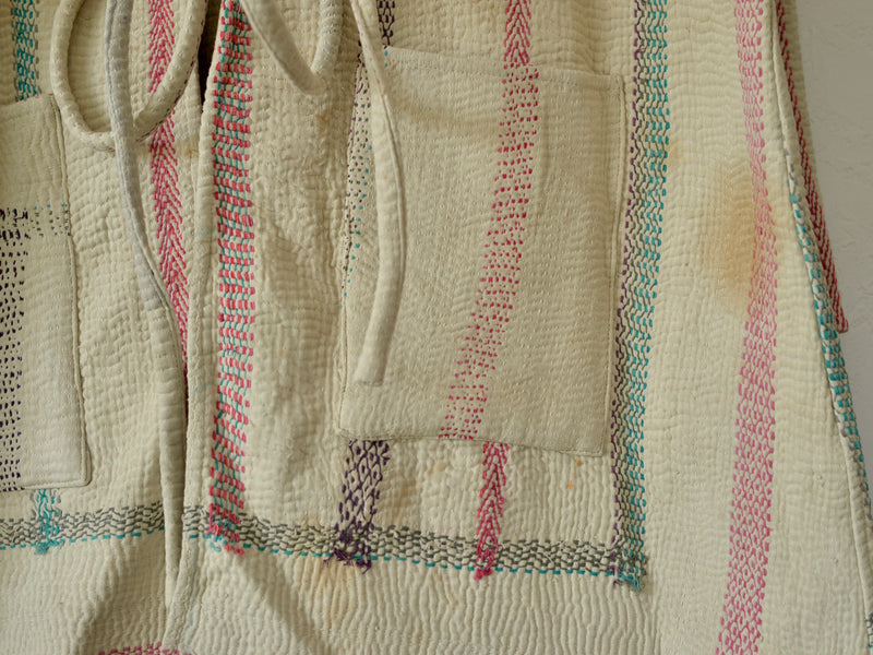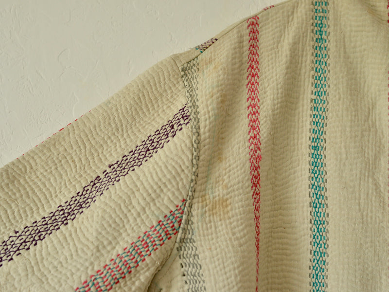 こちらは1枚のカンタキルトから仕立てたジャケット。染み、色あせ、印跡などがありますが、くったりとした布の質感がよく、着心地の良い1着です。