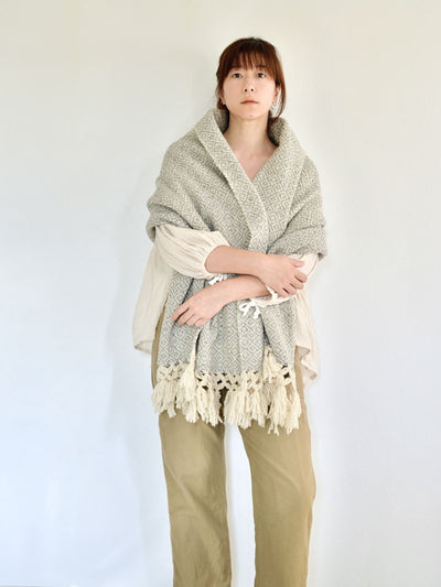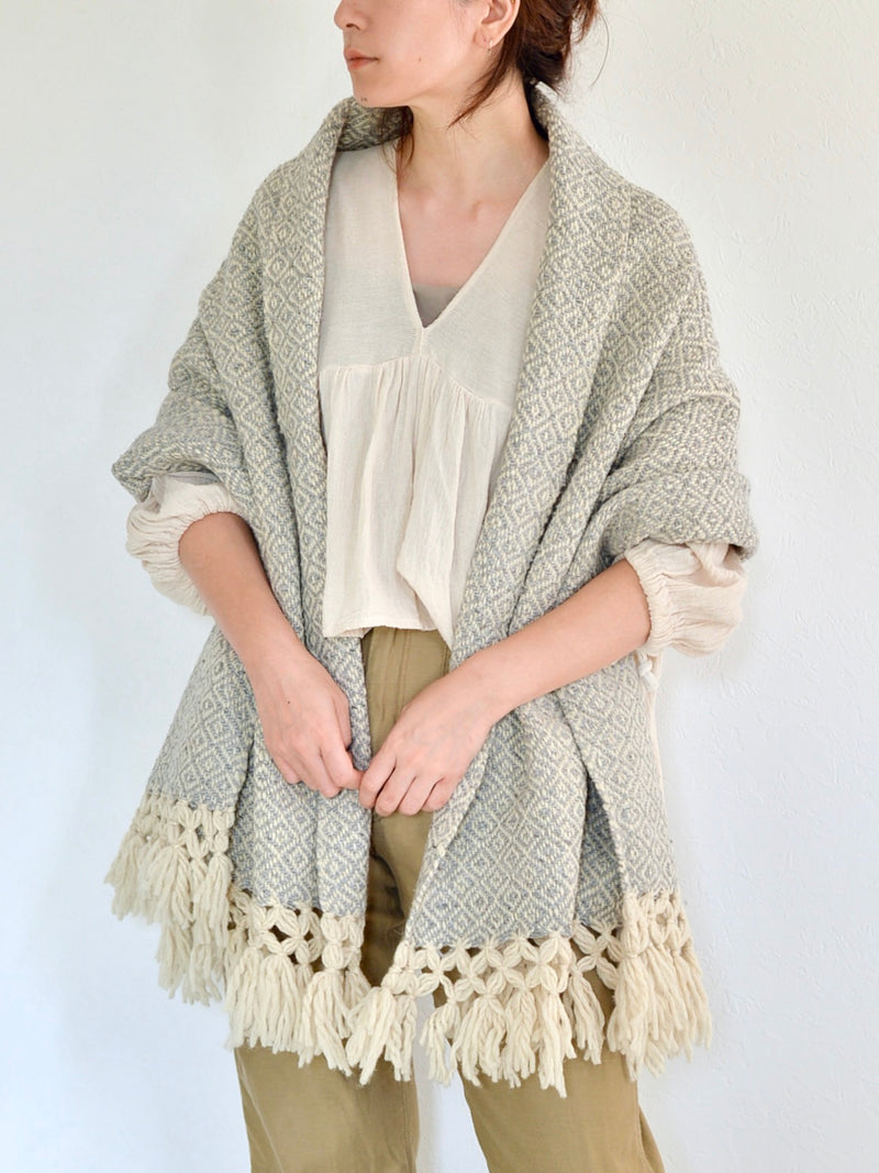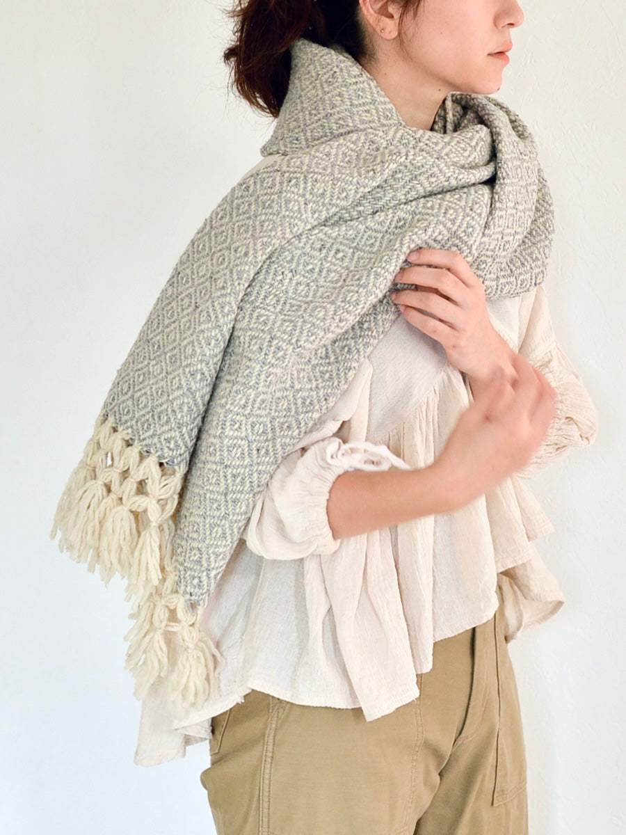 ほどよい厚みがあり、ショールを1/3に折って肩にかけると首回りがたち、
