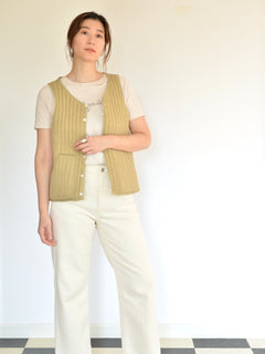 春はTシャツ、秋口の羽織り、冬はニットとあわせて室内着にも。