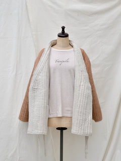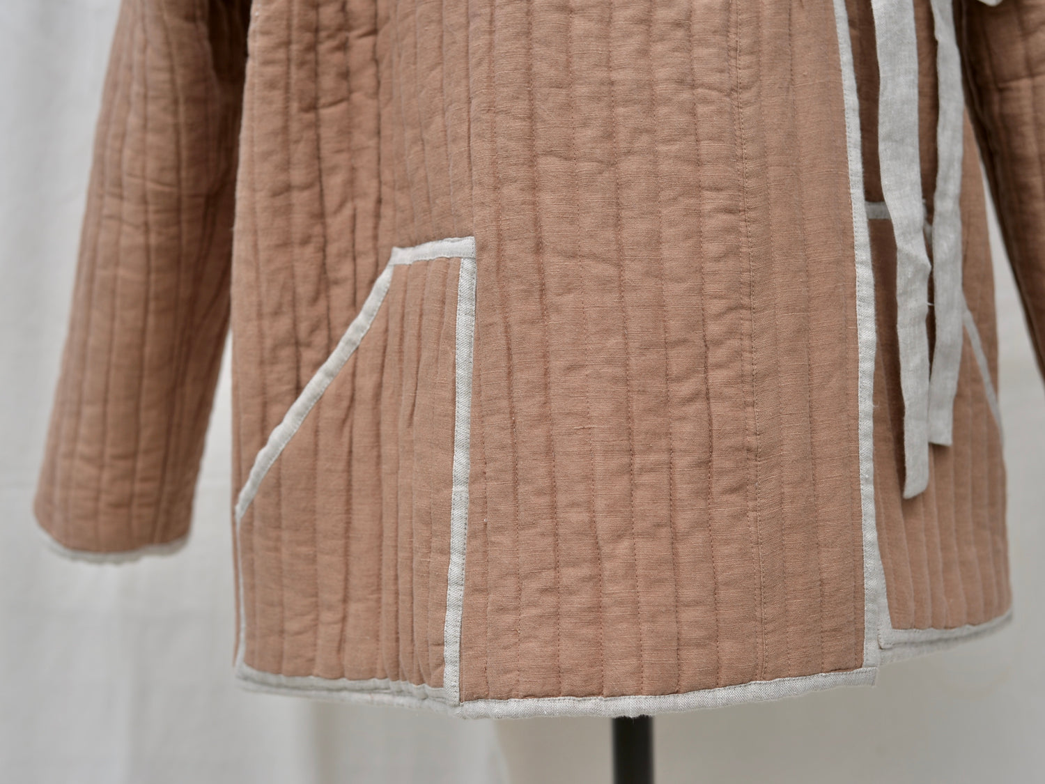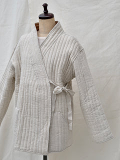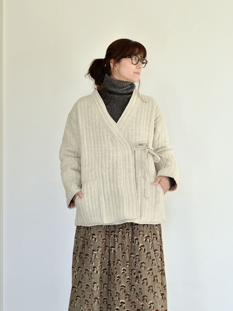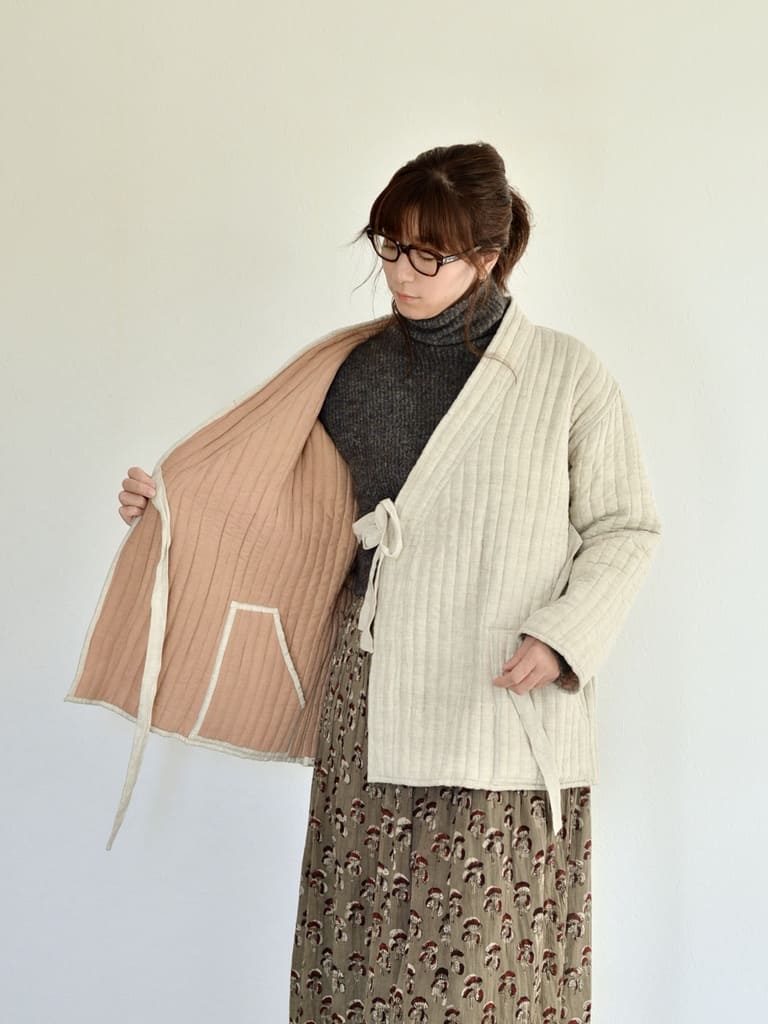 春はTシャツに、秋口の羽織り、冬はニットとあわせて、年月を重ねながら長く着られるリネンのキルティングジャケットです。