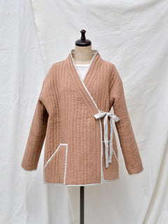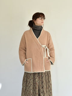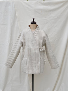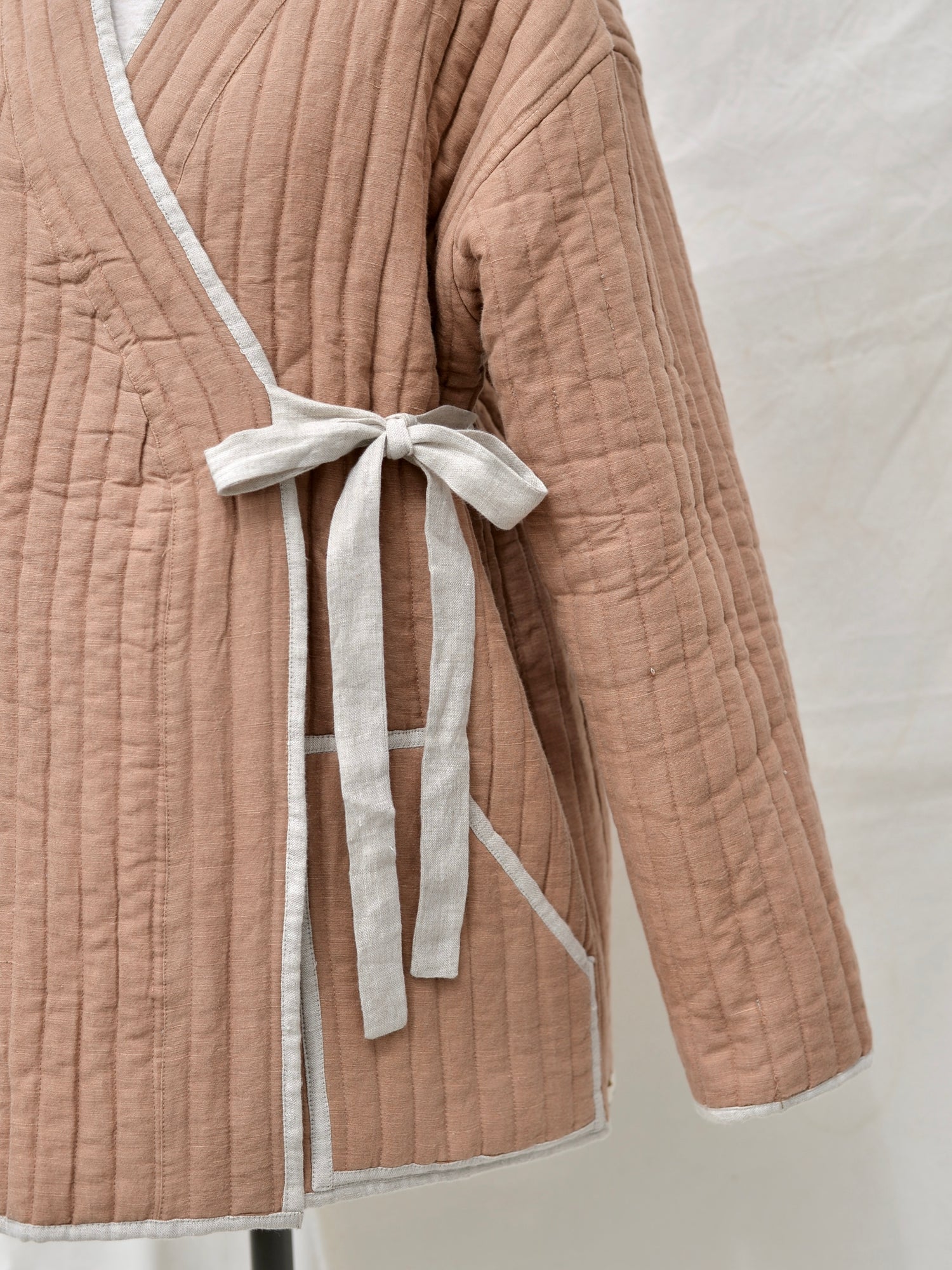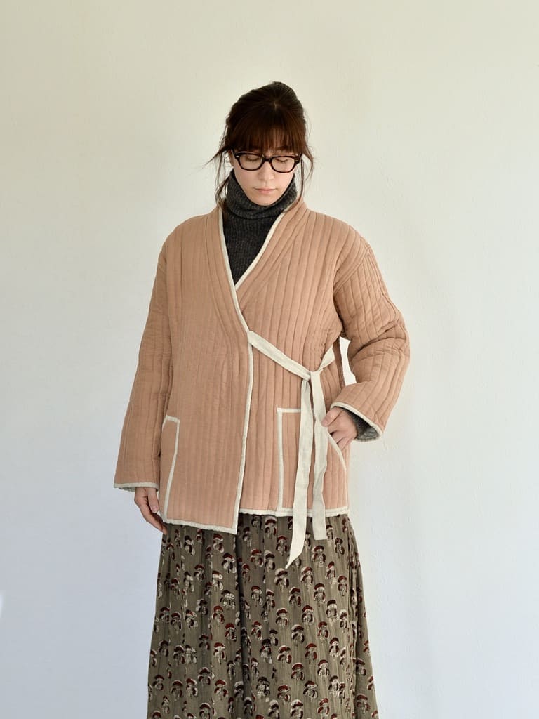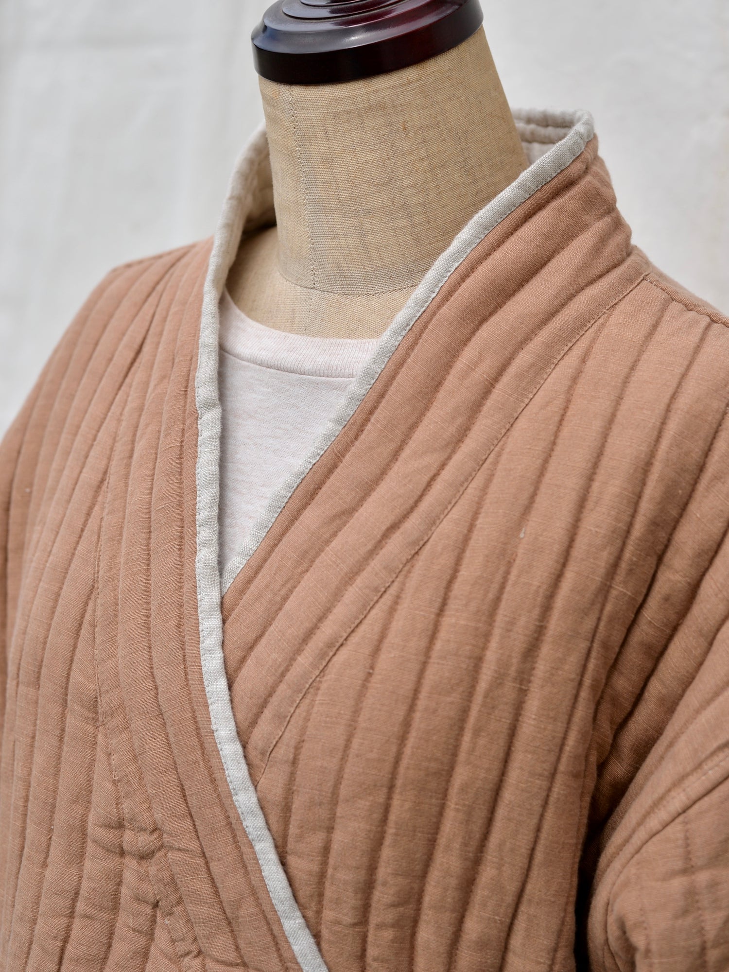 春はTシャツに、秋口の羽織り、冬はニットとあわせて、年月を重ねながら長く着られるリネンのキルティングジャケットです。