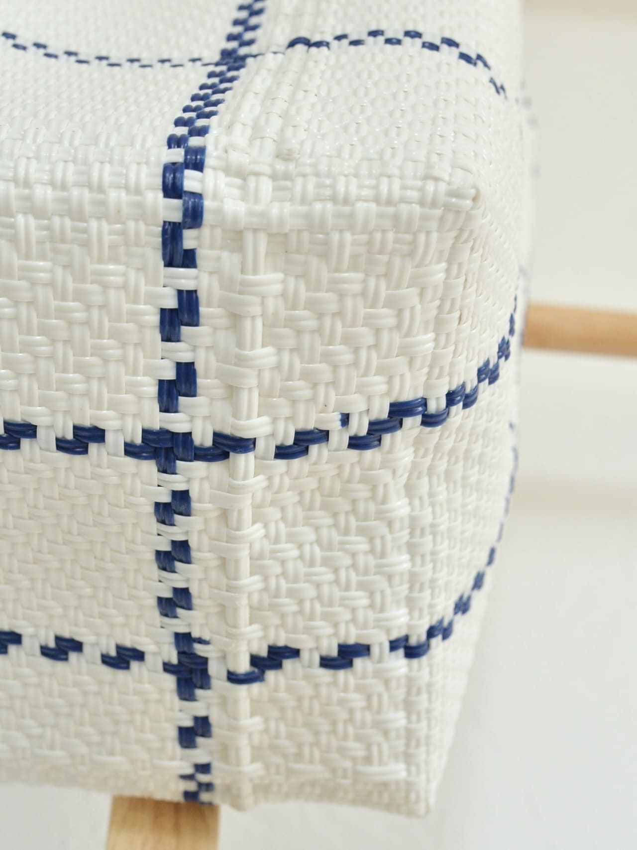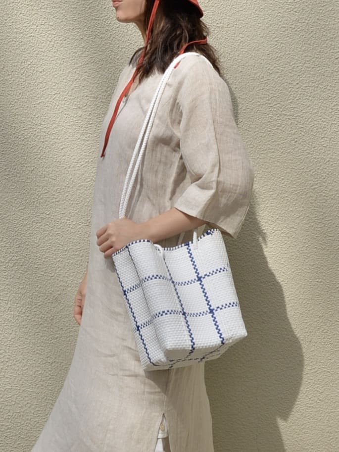 メルカドバッグの生産背景はさまざまで、もともと植物の繊維を割いて作る「かご」編み職人が、多くの工程を要する植物素材の代わりに再生プラスチックコードを使うようになり生産していることや、社会復帰の職業訓練として受刑者が作ることもあります。