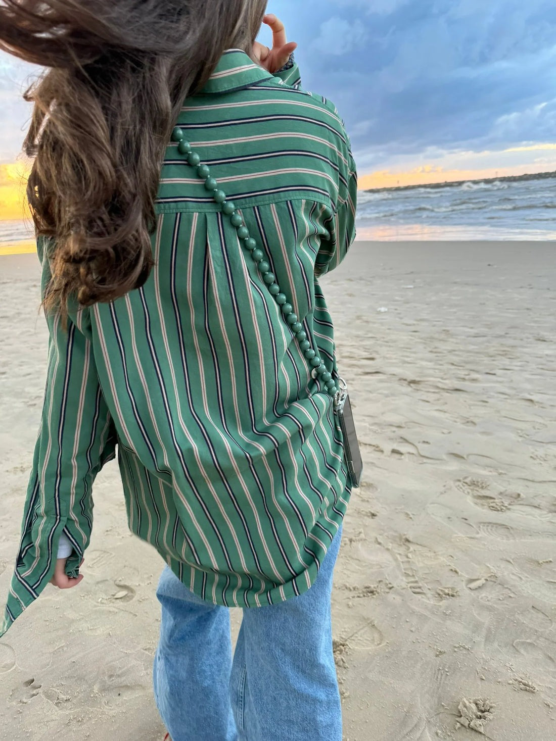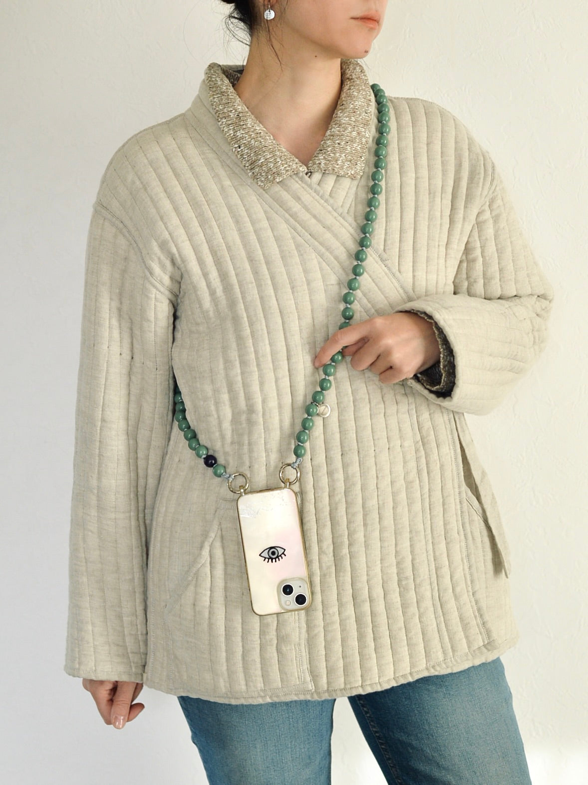 スポーティーな印象になりがちなスマホストラップですが程よい大きさのウッドビーズで身体に食い込みにくく、ネックレスのようにアクセントになるデザイン。