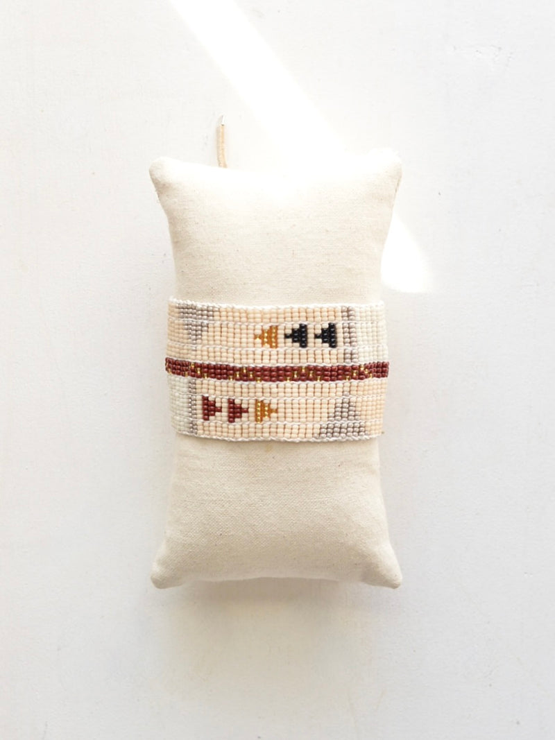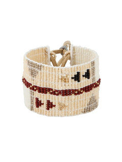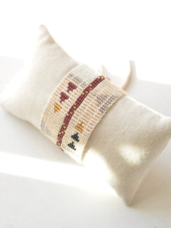 ガラスビーズを幾重にも重ねて織り上げた、精巧で重厚なカフ。大胆な三角形の模様と、時代を超越したシックなカラーの組み合わせが、昼夜を問わずどんなスタイルにもマッチする、主役級のアイテム。