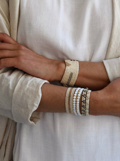 高品質なガラスビーズと再生プラスチックボーンを再生糸で編み込んだ、しなやかなビーズブレスレット。