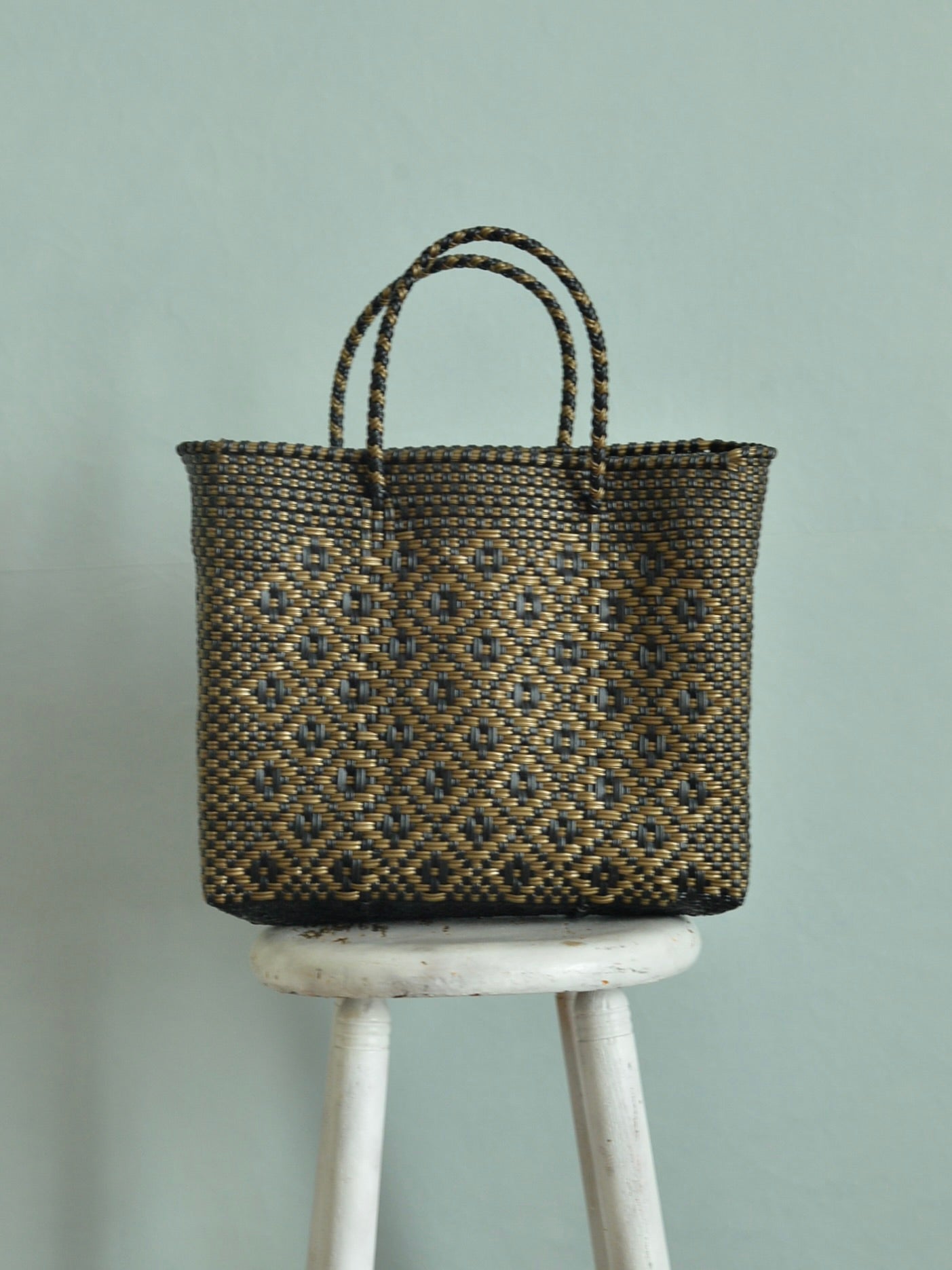 ペットボトルや海洋ごみをリサイクルしてプラスチックテープに加工し、木型にあわせて編んで手作業で編んで作るメキシコのメルカドバッグ 。