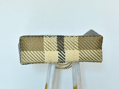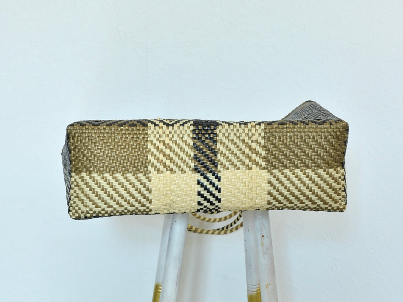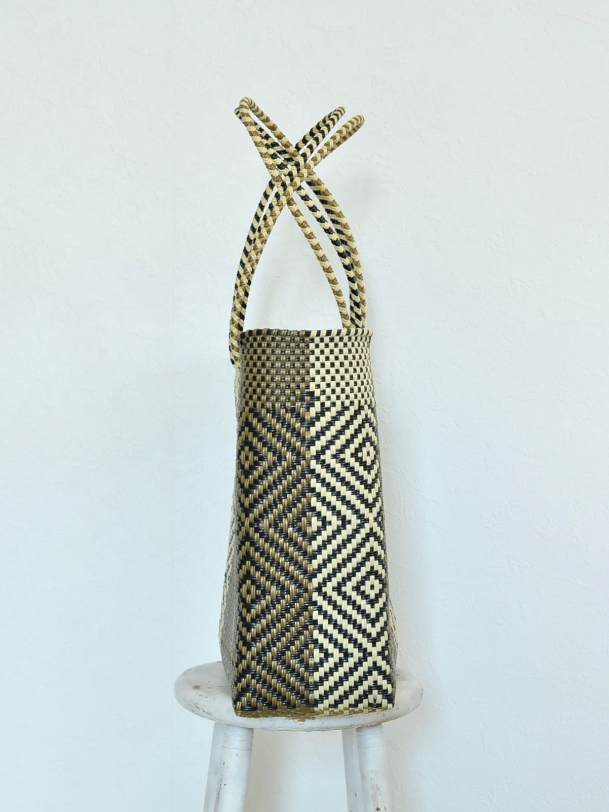 ペットボトルや海洋ごみをリサイクルしてプラスチックテープに加工し、木型にあわせて編んで手作業で編んで作るメキシコのメルカドバッグ。