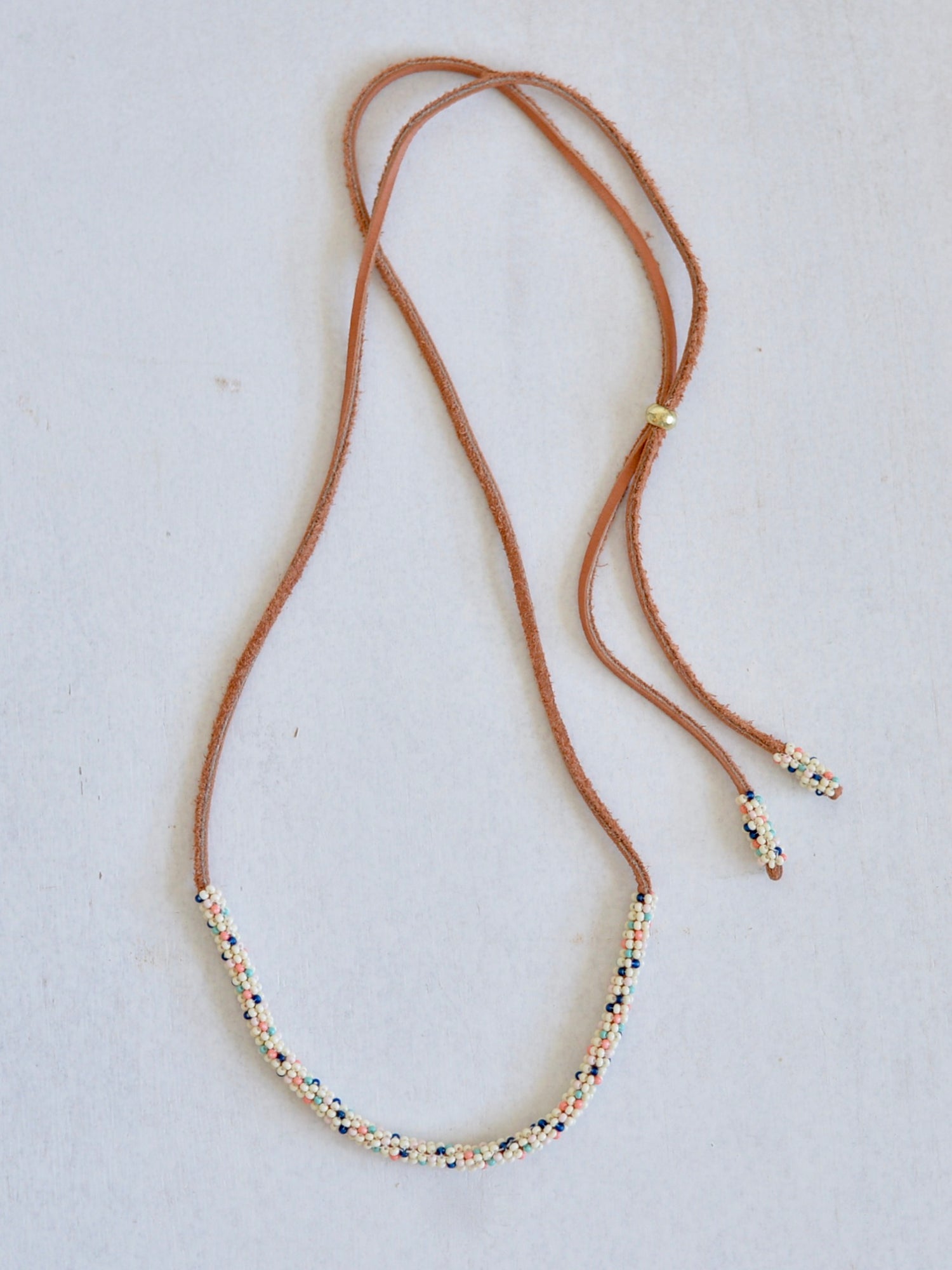 ちらばったマルチカラーがかわいい手編みのビーズネックレス 。