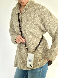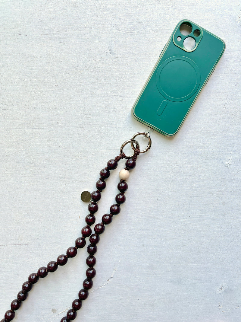 スポーティーな印象になりがちなスマホストラップですが程よい大きさのウッドビーズで身体に食い込みにくく、ネックレスのようにアクセントになるデザイン。
