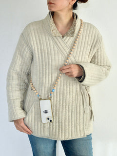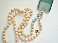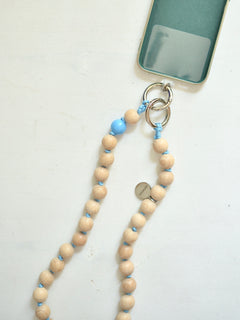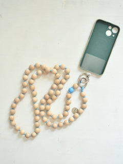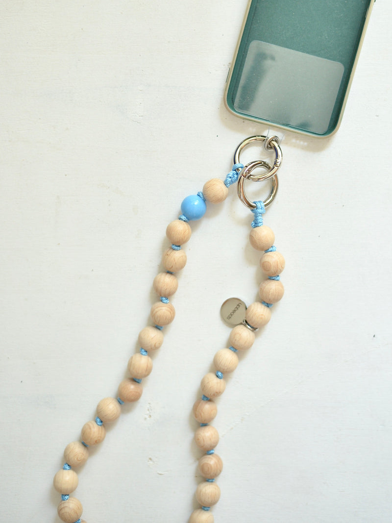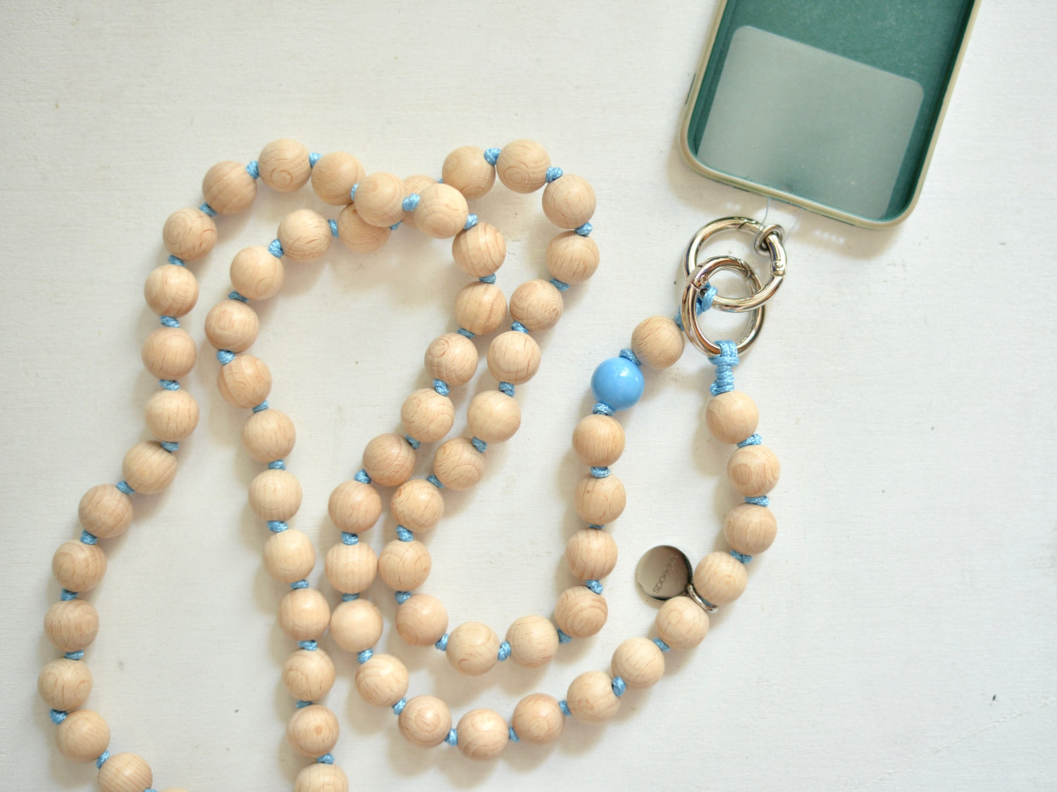 スポーティーな印象になりがちなスマホストラップですが程よい大きさのウッドビーズで身体に食い込みにくく、ネックレスのようにアクセントになるデザイン。