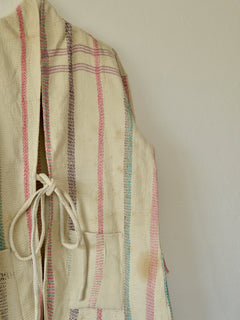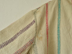こちらは1枚のカンタキルトから仕立てたジャケット。染み、色あせ、印跡などがありますが、くったりとした布の質感がよく、着心地の良い1着です。