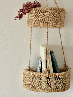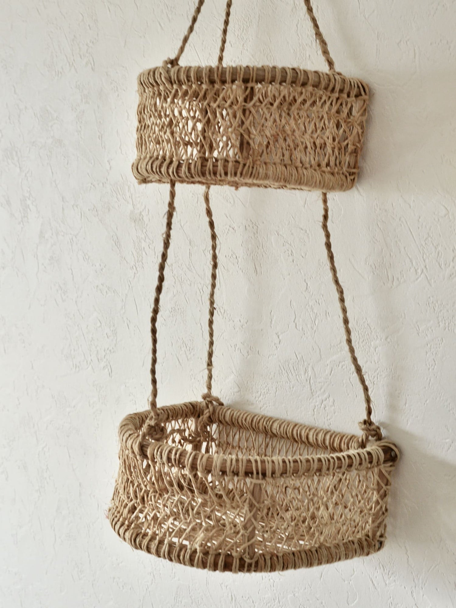 【サイズ】紐から下段のかご底まで約 62cm (長さ変更可能)上段19cm×13cm 下段16cm×24cm 手仕事品のため個体差があります。